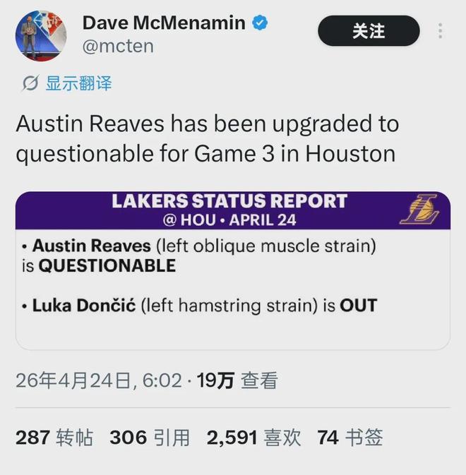 湖人目前2比0领先,如今里夫斯伤停还不到3周,有必要着急复出吗?出战成疑并不意味着一定会上场,教主猜测里夫斯应该不会打G3,至少等到4月27日的G4才会正式登场。不过,可以确认的是,季后赛首轮里夫斯肯定能够复出。
