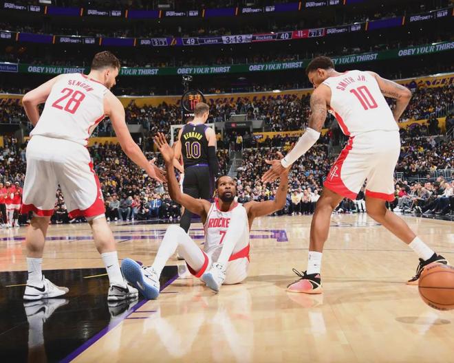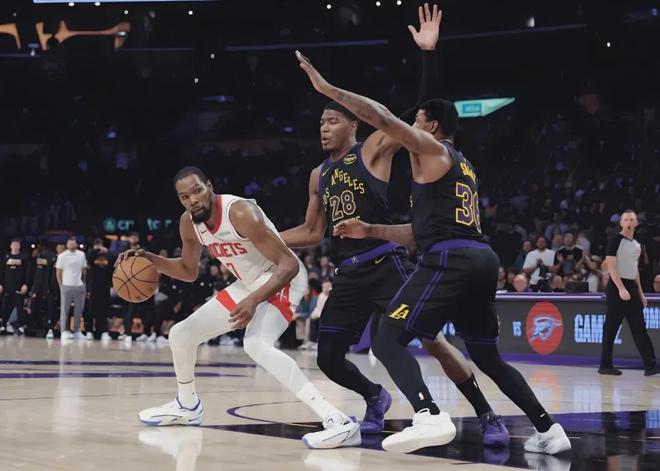 火箭扎心了!杜兰特此前在训练中被队友撞伤膝盖,缺席季后赛首轮G1。杜兰特G2紧急复出,鏖战41分钟扭伤脚踝。即便杜兰特G3能够出战,也不是100%满血状态。过去三次跟湖人交手,杜兰特一共遭遇61次包夹,出现20次失误。